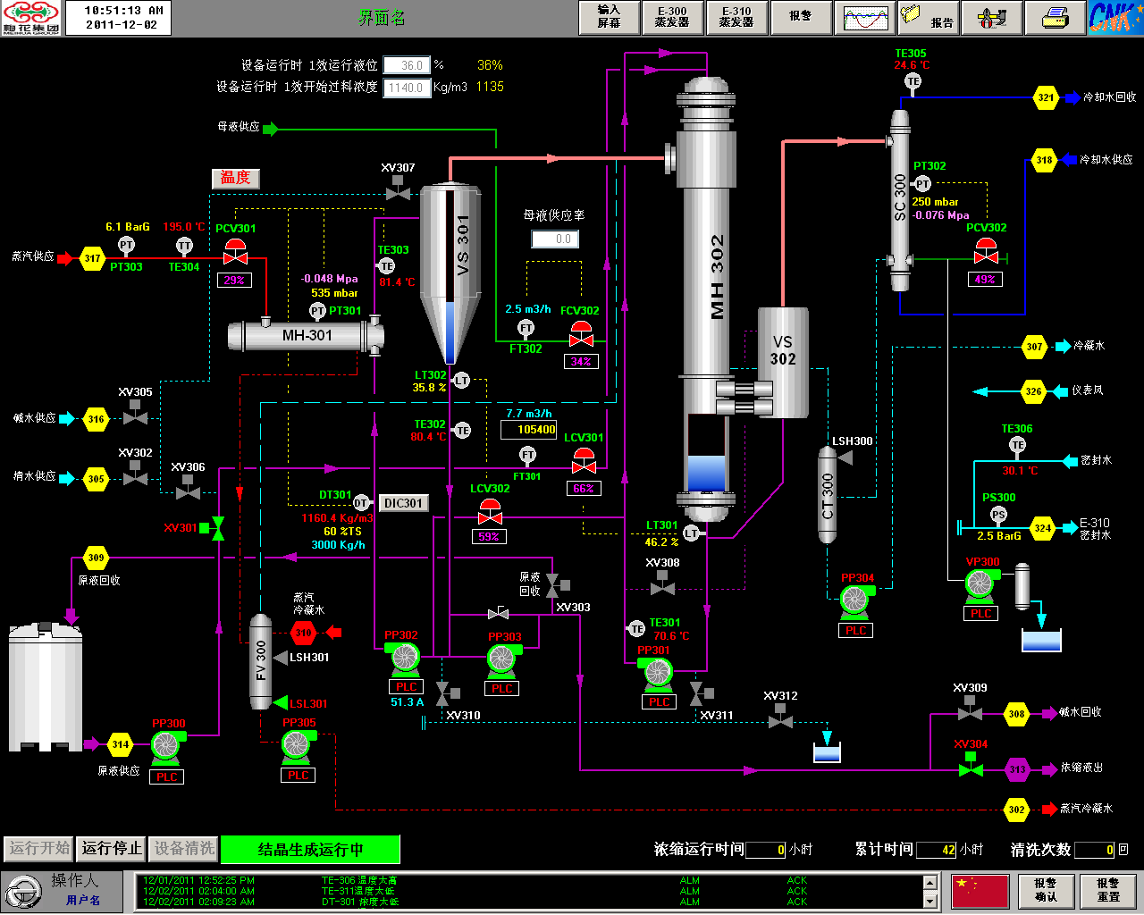 使用手动操作或是半自动运行的蒸发设备时,由于操作人员的不规范操作或是失误,设备会出现列管严重结垢等现象。为了防止操作人员失误或误操作,CNK一同提供一键式标准清洗程序和防污染程序。